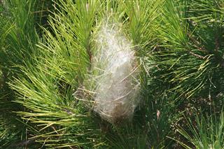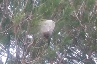 Ninhos da lagarta na copa dum pinheiro.